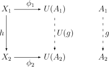 We'll now set up a functor $F$ in ${\bf D}\longrightarrow{\bf C}$ with object map $FY_i=A_{Y_i}$ and arrow map $\mathrm{Hom}(Y_i,Y_j)\to\mathrm{Hom}(A_{Y_i},A_{Y_j})$ according to, e.g. $F(h_{ij}):=g_{ij}$. This is an so called adjoint functor to $G$. Note that the above diagram now also tells us that the $\eta_{Y_i}$ are the components of a natural transformation $\eta:\mathrm{nat}(1_{\bf D},GF)$.